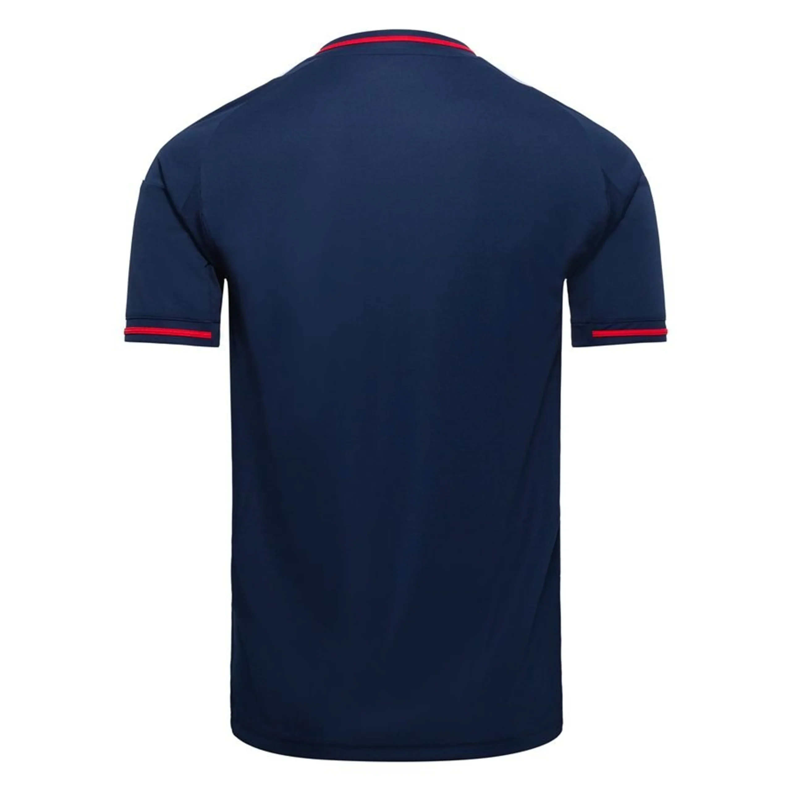 The Adidas Olympique Lyon 2025-26 away kit features a dark “Night Indigo” navy base with thin, alternating red and bright blue vertical pinstripes on the front. It includes an overlapping V-collar/Henley style with red trim, mirrored on the sleeve cuffs, with “FIERS DE NOS COULEURS” (Proud of Our Colors) inside the collar.