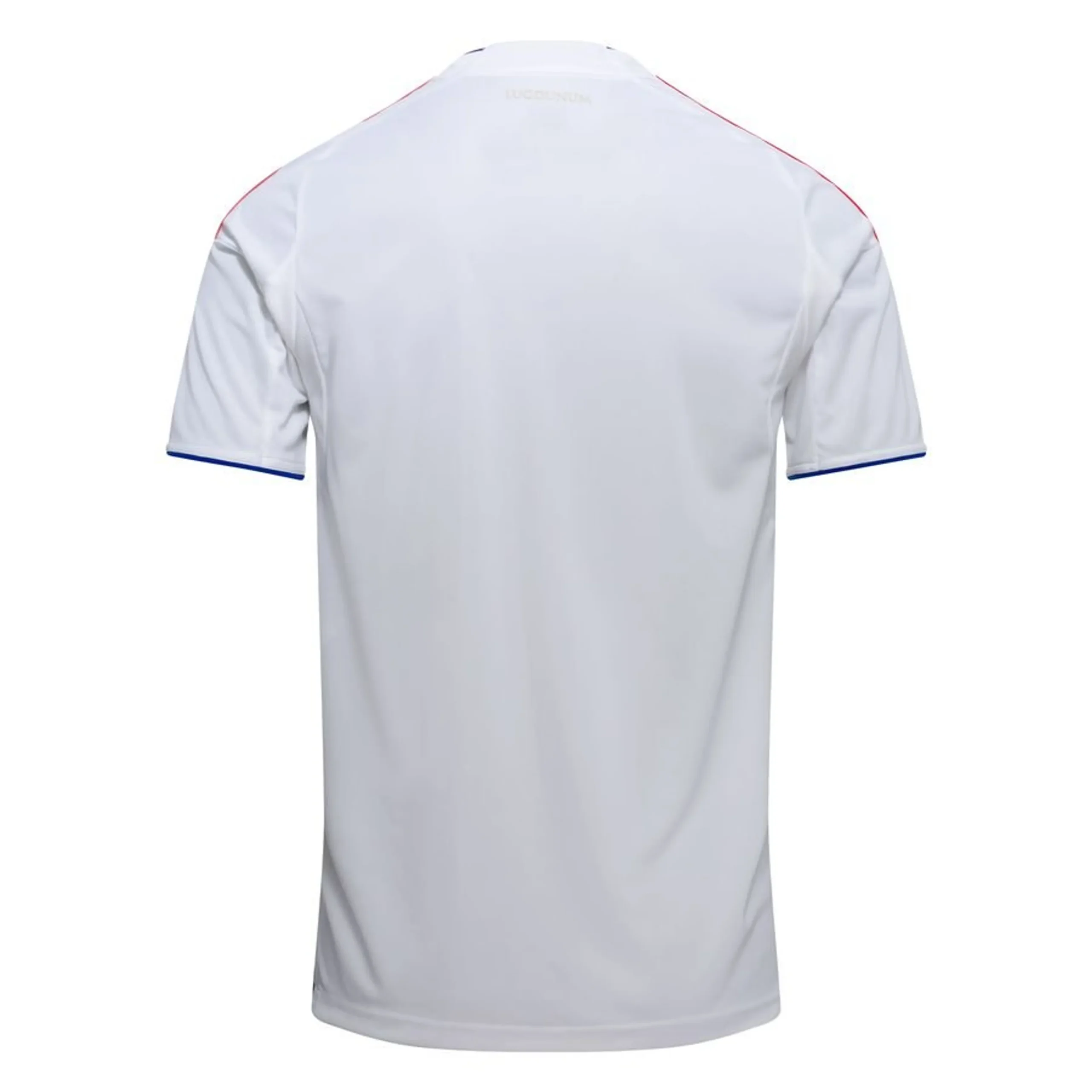 The Adidas Olympique Lyonnais 25/26 home kit is a white-based jersey featuring a distinct red and blue central stripe, paying homage to the club’s traditional colors and Roman heritage (Lugdunum) with a subtle, embossed mosaic pattern. It features a “Teamgeist” collar, red shoulder stripes, and is made from 100% recycled polyester with moisture-managing AEROREADY technology.