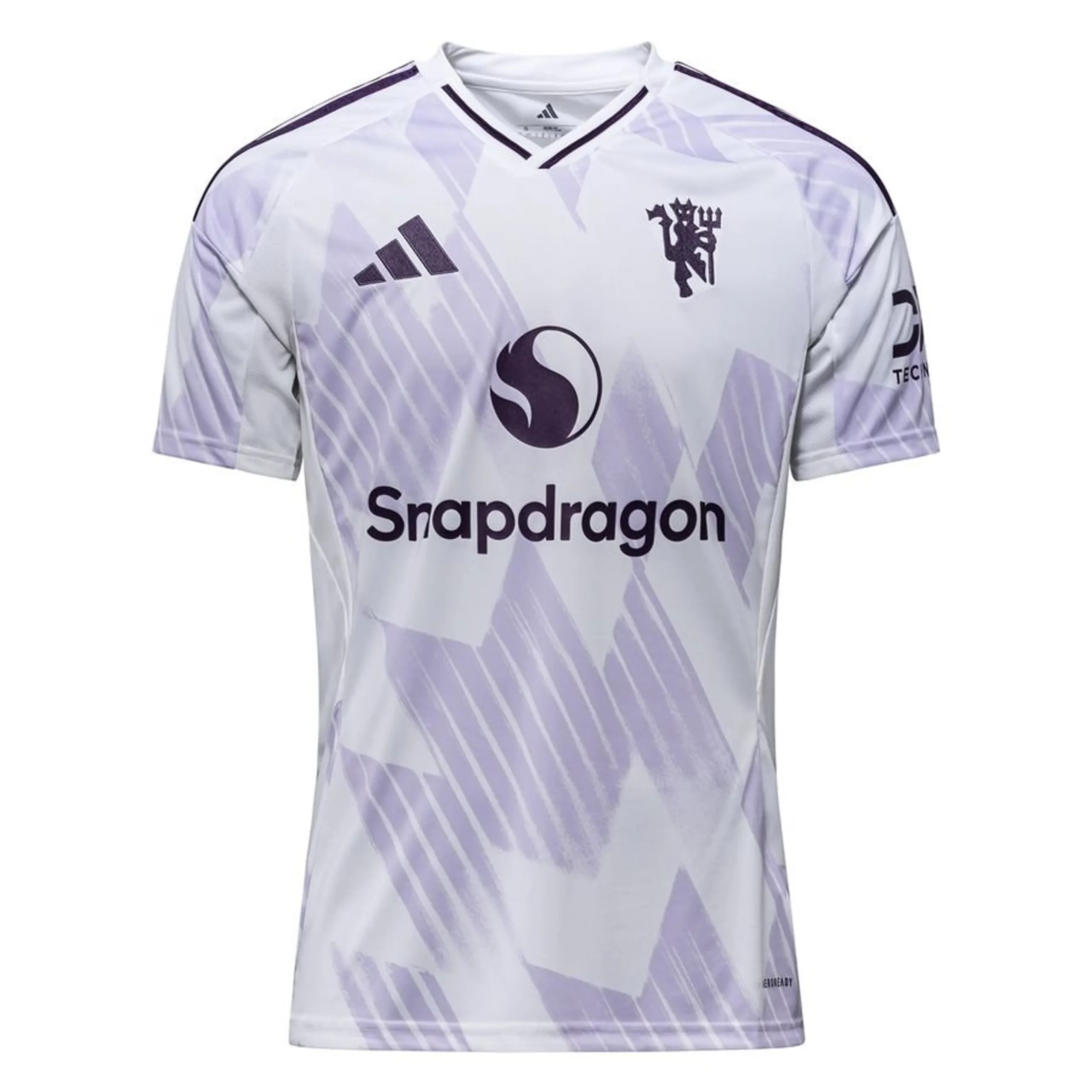 The Manchester United 25/26 away kit, released by Adidas in July 2025, features a white base with a distinct light purple and lilac “snowflake” graphic, inspired by the 1990–1992 away kit. The design includes a metallic Red Devil crest, an overlapping v-collar, and purple accents on the shoulders, paired with purple shorts.